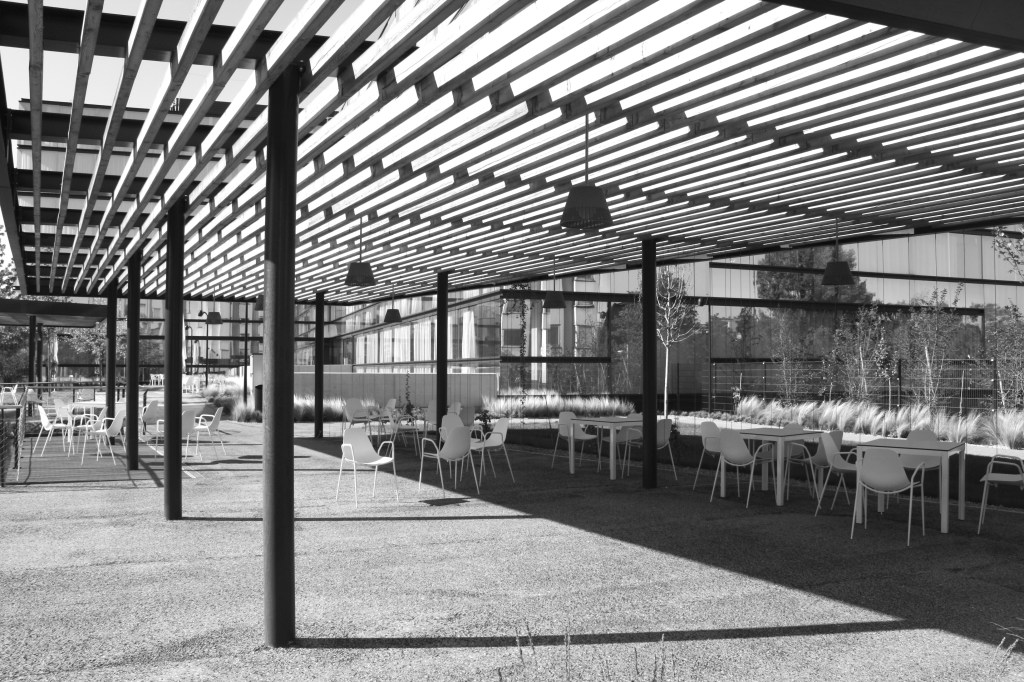Ähnlich geschickt, atmosphärisch aber doch ganz anders, wurde im Pflegewohnhaus Donaustadt gearbeitet. Das 2013 fertiggestellte Gebäude von Delugan Meissl Associated Architects präsentiert sich in der Optik einer schicken Privatklinik. Passend dazu die sinnliche Entwurfssprache der Freiraumgestaltung von Rajek Barosch Landschaftsarchitektur. Die komplexe Gebäudekonfiguration hat schwierige freiräumliche Bedingungen für die Landschaftsarchitekten geschaffen: Mehrere, eher klein dimensionierte Resträume, die wohl kaum die Freiraumqualitäten eines großen, zusammenhängenden Parks generieren können. Eine Befürchtung, über die man sich geschickt hinweggesetzt hat. Isolde Rajek und Oliver Barosch haben sich die Kleinteiligkeit der Außenräume, die sich über zwei Ebenen erstrecken, zu Nutzen gemacht und ein funktionales Freiraumangebot geschaffen. Auf Grund der konsequent durchgehaltenen Gestaltungssprache und den geschickt entwickelten Blickbeziehungen, werden die Höfe, Dachgärten und Terrassen als Einheit wahrgenommen. Zahlreiche Glasfronten zeigen verschiedene Ausschnitte des Freiraumes und machen den Außenraum auch von Innen erlebbar. So wird der Garten einer Kindertagesstätte, der sich entlang der Eingangshalle und dem Café erstreckt, zum zentralen Ereignis und zum Unterhaltungsprogramm für Bewohner und Besucher. Die unbeschwerte Fröhlichkeit und Lebendigkeit der spielenden Kinder tut hier besonders gut. Die wunderbare Landschaftsarchitektur auch. Der Allgemeingarten mit Gräserbeeten, Rasenflächen und Obstspalieren ist lebendiger Aufenthalts-, Kommunikations- und Naturraum. Durch feine Details gibt er immer wieder neue Eindrücke frei. Zwei Pergolen, die sich um ein Biotop formieren, spenden Schatten und versprühen mit samt der zarten Möblierung und den geflochtenen Hängeleuchten so etwas wie 50er Jahre Charme.