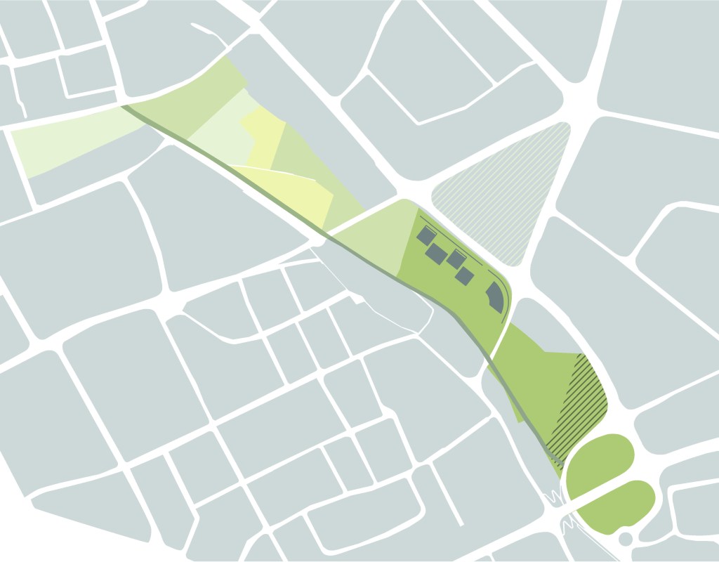 Zur Stärkung des Grünzuges sowie zur ökologischen und funktionalen Vernetzung der Freiflächen werden einerseits die übergeordneten, angrenzenden Straßenzüge zu Alleen erweitert. Andererseits sollen freiräumliche Potentialflächen zum integralen Teil des Grünzuges werden. Durch diese Maßnahmen wächst der Stadtpark in drei Richtungen. Die bestehenden Park- und Sportflächen bleiben als Bestandsfragmente erhalten und werden Teil einer Freiraumsequenz, die ein breites Spektrum an Möglichkeitsräumen für die BewohnerInnen der umliegenden Wohngebiete bereitstellt.