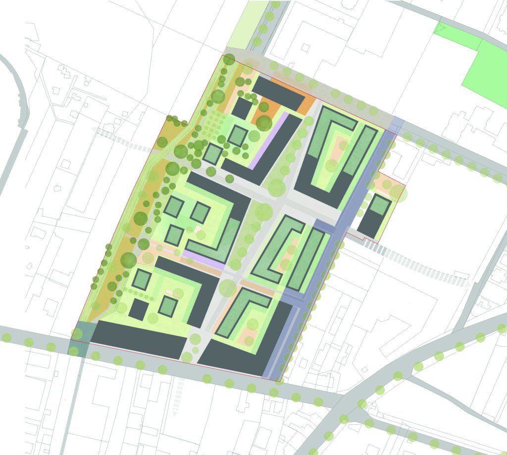 gestaltetem Park, urbaner Platz- und Erschließungsstruktur