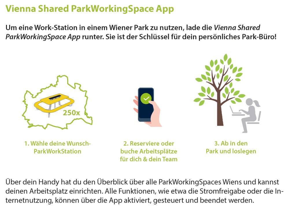 Große bis mittelgroße Wiener Parks verfügen meist über entsprechende Raumressourcen und über kühlendes Grün, doch bislang fehlt die zum Arbeiten benötigte Arbeitsinfrastruktur (Strom, Mobiliar, Wlan etc). Aktuell arbeiten ein Team aus PlanerInnen und ForscherInnen daher an der Entwicklung von Energie-autarken, App-gesteuerten Freiraumarbeitsplätzen, den Vienna Park Working Spaces, die die notwendige Infrastruktur in ausgewählten öffentlichen Wiener Parks bereitstellen sollen.