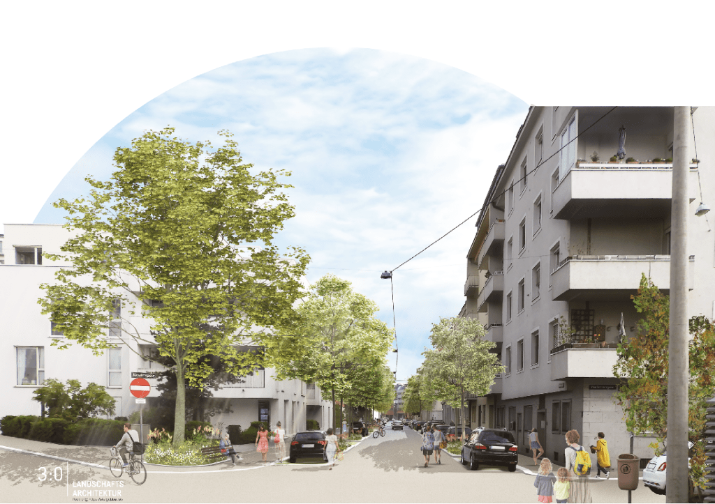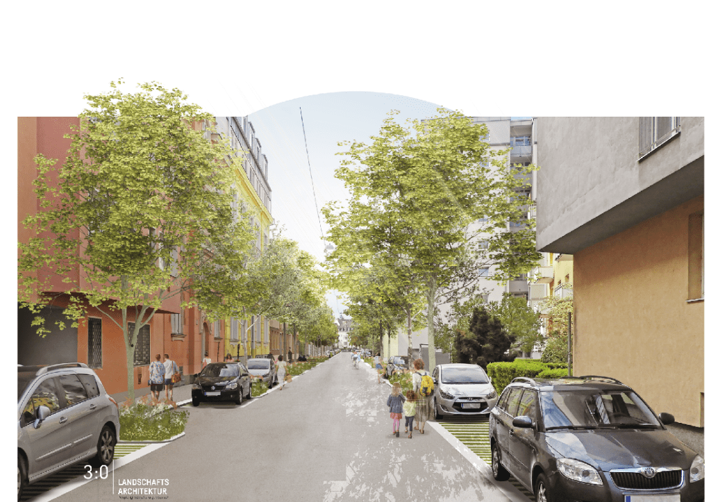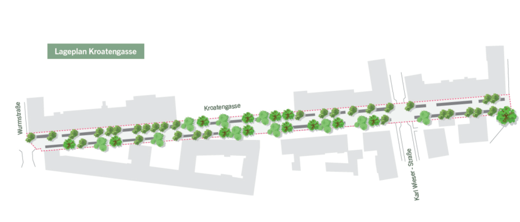 Hundert neue Bäume pro Jahr hat man sich also vorgenommen. Den diesjährigen Auftakt macht das Projekt Kroatengasse. Der Straßenzug wird auf einer Länge von 340 Metern mit rund 50 Bäumen bepflanzt. Auch begrünte Parkplätze sowie Unterpflanzungen der Bäume mit Blütenstauden werden die Straße künftig kühlen. Die Bäume erhöhen so den Beschattungsgrad von aktuell 0,5 Prozent auf beachtliche 35 Prozent. Möglich wird die Dichte an Baumpflanzungen aber erst durch die neue Bautechnik des Schwammstadt-Prinzips. Dieses macht Baumstandorte möglich, die bislang als technisch nicht umsetzbar galten. „Bei diesem Verfahren werden rund 36 Kubikmeter unterirdischer Straßenraum für jeden Baum frei gemacht und durch Einbringung eines entsprechenden Füllmaterials aufbereitet. Durch den baulich erweiterten Wurzelraum können sich Bäume besser entfalten und wieder entsprechende Kronen ausbilden. Regenwasser kann im Baumwurzelbereich versickern und die Bäume über das Regenereignis hinaus mit Wasser versorgen“, erklärt Daniel Zimmermann vom planungszuständigen Büro 3:0 Landschaftsarchitektur.