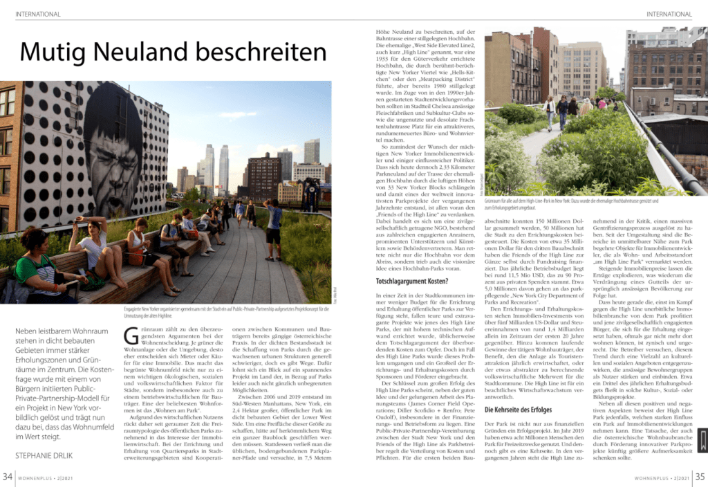 Neben leistbarem Wohnraum stehen in dicht bebauten Gebieten immer stärker Erholungszonen und Grünräume im Zentrum der Überlegungen. Die Kostenfrage wurde in einem von Bürger*innen initiierten Parkprojekt in New York durch ein Public-Private-Partnership-Modell gelöst. Der entstandene High-Line Park trägt seither dazu bei, dass sein Wohnumfeld im Wert steigt. Ein Beitrag von Stephanie Drlik in WohnenPlus 02/2021.