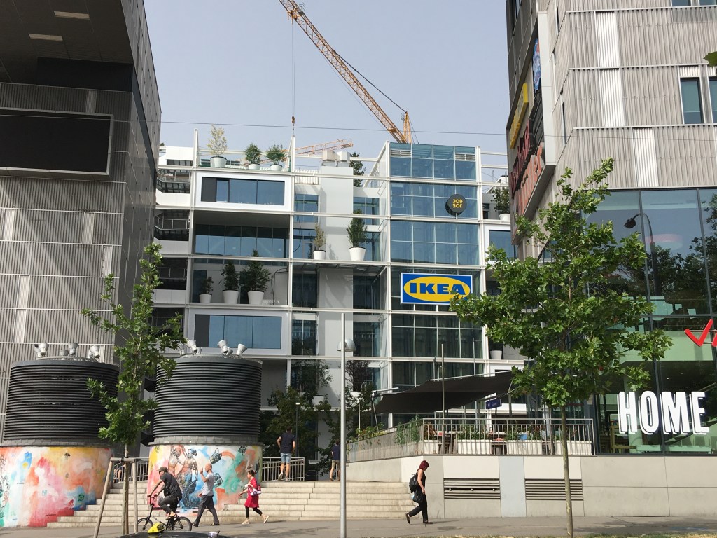 Das Projekt war insbesondere in der ersten Phase der Immobilienentwicklung umstritten, als der Vorgängerbau, das blaue Gründerzeithaus auf der Mariahilferstraße 132, abgetragen und die Fläche von der ÖBB an IKEA verkauft wurde. Für viele Expertinnen und Experten wäre das Freiwerden eines großen Baublocks eine seltene Chance gewesen, eine durch Infrastruktur und Verkehr massiv belastete Liegenschaft neben Gürtel und Westbahnhof eine zu nützen, um dem Grünraummangel der angrenzenden Bezirke Neubau und Rudolfsheim-Fünfhaus entgegenzuwirken. Ein Park oder ein begrünter Platz hätte es werden können, doch die wirtschaftlichen Argumente eines City-IKEAs waren überzeugender. Zudem brachte IKEA ein durchaus beeindruckendes stadt- und klimaschonendes Konzept ein, das auf Fußgänger, Öffi- und Radfahrer ausgerichtet ist. Sperrgut wird frei Haus geliefert, den Rest nimmt man in der bekannten blauen Tasche mit. Statt den Autos, die üblicherweise auf dem Dach parken, wurde ein öffentlich zugänglicher und für die Allgemeinheit konsumfrei nutzbarer Dachfreiraum in Aussicht gestellt. Weiters nahm sich IKEA eine umfassende Bauwerksbegrünung vor, die Kühlung und eine Vielfalt an Arten in der Stadt fördern soll. Kurz und Gut, das billigmöbelproduzierende Unternehmen möchte mit diesem Projekt zum Vorreiter in Sachen Nachhaltigkeit werden.