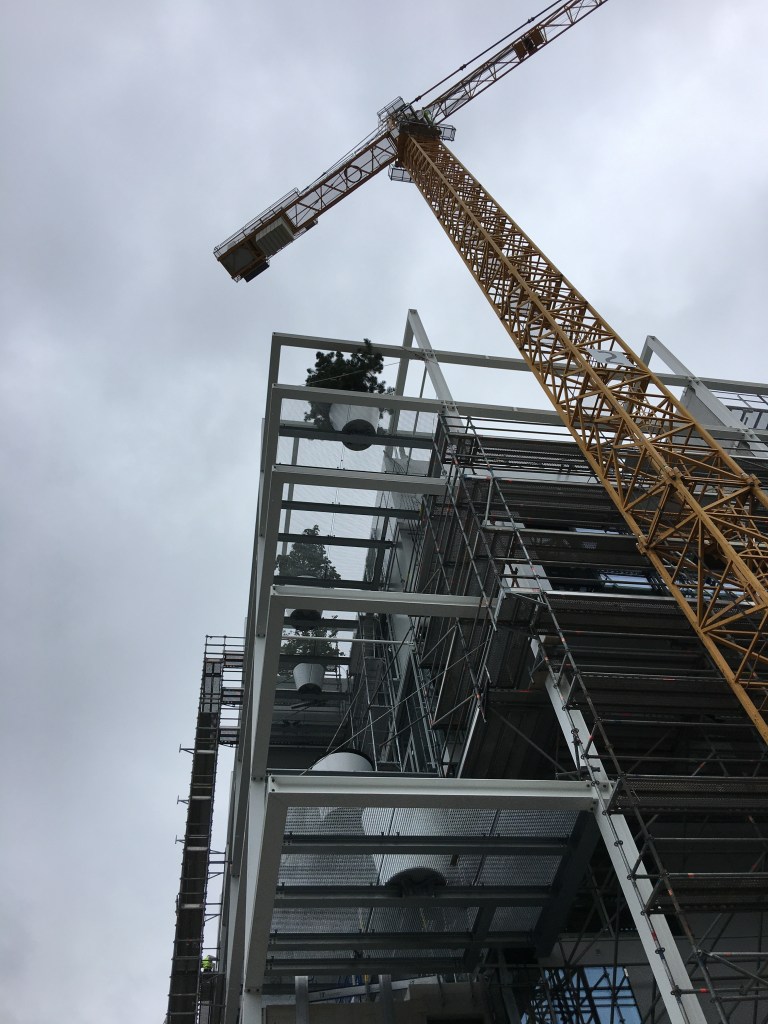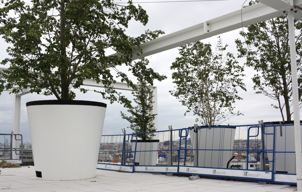Die Detailplanung und Umsetzungsbegleitung dieses außergewöhnlichen Vorhabens erfolgte durch das Büro Kräftner Landschaftsarchitektur im Team mit den BegrünungsinnovatorInnen von Green4Cities. Unterstützt wurden sie vom Garten- und Landschaftsbaubetrieb Grünbau Jakel und dem Bewässerungstechniker Raintime. Geballte Grün-Kompetenz, die es definitiv gebraucht hat. „Das System der mit Bäumen bepflanzten Töpfe ist gänzlich neu und hat in der Planung und Realisierung viele Fragen aufgeworfen“, erzählt Landschaftsarchitekt und Büroinhaber Joachim Kräftner. Zum einen stellte die Statik eine Herausforderung dar, denn die Bäume vergrößern durch ihr Wachstum Gewicht und Windangriffsfläche. „Als Landschaftsarchitekt kann ich natürlich gewisse Basisdaten über die Pflanze bereitstellen, aber Erfahrungswissen wie sich 160 in Blumentöpfen gepflanzte und an der Gebäudehülle angebrachte Bäume entwickeln, hatten auch wir nicht“, gibt Kräftner zu. Ein Windgutachten hat daher für jede Baumart und jeden Topfstandort anhand des jeweiligen Blattflächenindex Winddurchlässigkeitswerte berechnet. Damit Bäume und Töpfe nicht kippen, ist jeder Trog einzeln an Gebäude-umspannende Stahlträger montiert. Weiters wurde der Wurzelballen an Ösen im Topf verankert und die Kronen der mittelgroßen und großen Bäume zusätzlich mit Seilen an der Stahlträgerkonstruktion angebunden.