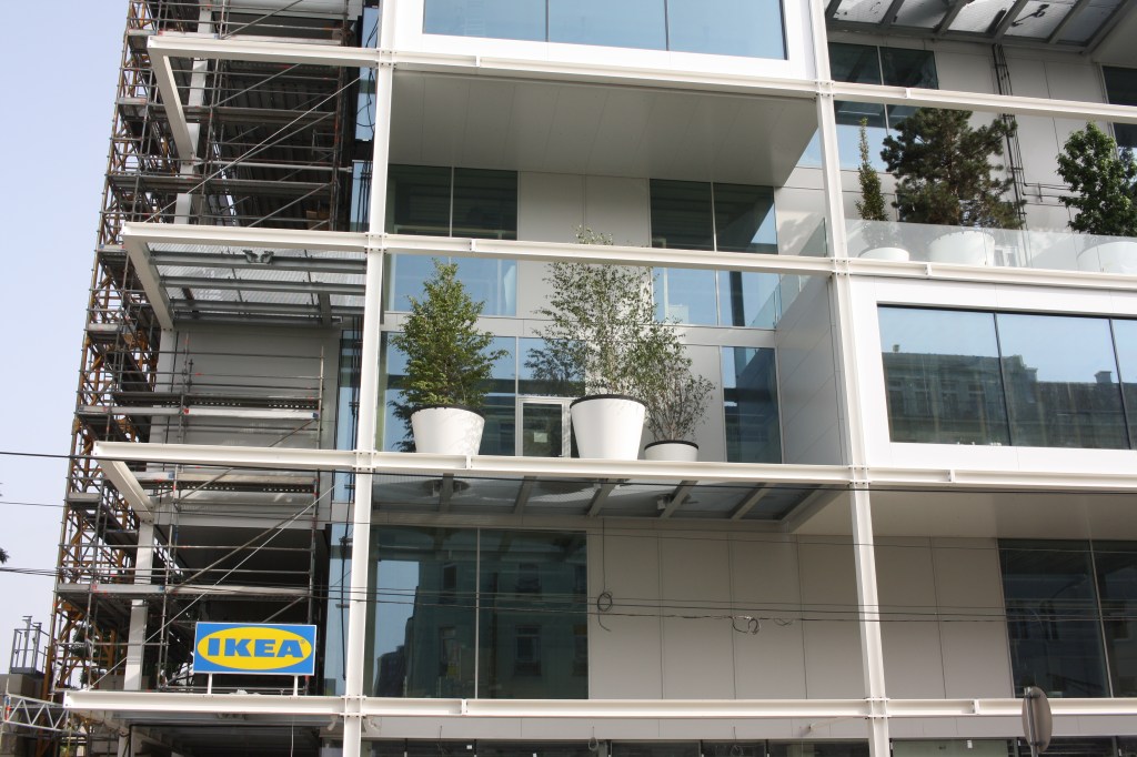 Von Projekten wie dem Mailänder „Bosco Verticale“, einem Hochhauskomplex mit waldartiger Fassadenbegrünung, weiß man, dass ein gewisser Teil der gepflanzten Bäume im Laufe der ersten Jahre eingeht. Im Gegensatz zum Bosco Verticale werden aber beim Wiener City-IKEA Baumausfälle nicht nachgesetzt. Denn die Großgehölze können ausschließlich mit einem Baukran gehoben und platziert werden, über das Gebäudeinnere gibt keinen entsprechenden Zugang. Die PlanerInnen versuchen daher durch einen besonders sorgsamen Umgang mit den Gehölzen Ausfälle tunlichst zu verhindern. „Bäume sind lebendes Material, man kann sie nicht einfach einkaufen und abstellen bis sie zum Einsatz kommen“, erklärt Kräftner. Die Großgehölze wurden daher bereits vor einem Jahr von der deutschen Baumschule Lappen erworben und zur Akklimatisierung zum heimischen Baumschulpartner Haselberger geliefert, bevor sie weiter nach Wien gereist und zu Topfpflanzen geworden sind.