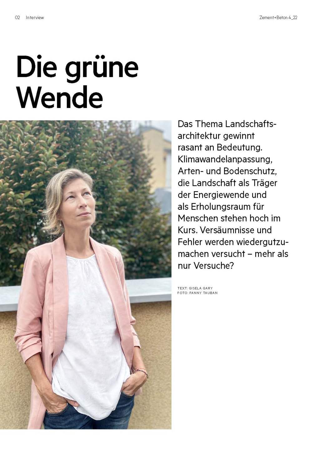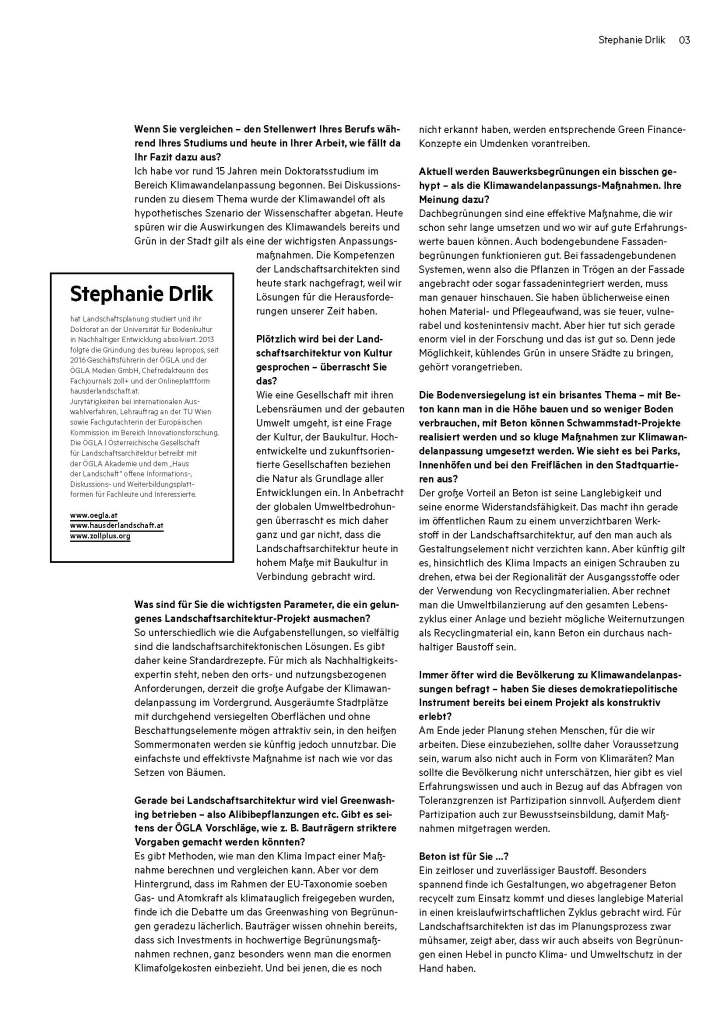Texte von laproposDezember 4, 20224:28 pmDezember 5, 2022 Im Interview zur Grünen Wende Stephanie Drlik im Gespräch mit Gisela Gary über „Die Grüne Wende“ im aktuellen Zement + Beton Magazin 4_22 Auf X teilen (Wird in neuem Fenster geöffnet) X Auf Facebook teilen (Wird in neuem Fenster geöffnet) Facebook Auf Pinterest teilen (Wird in neuem Fenster geöffnet) Pinterest Auf LinkedIn teilen (Wird in neuem Fenster geöffnet) LinkedIn Einen Link per E-Mail an einen Freund senden (Wird in neuem Fenster geöffnet) E-Mail
