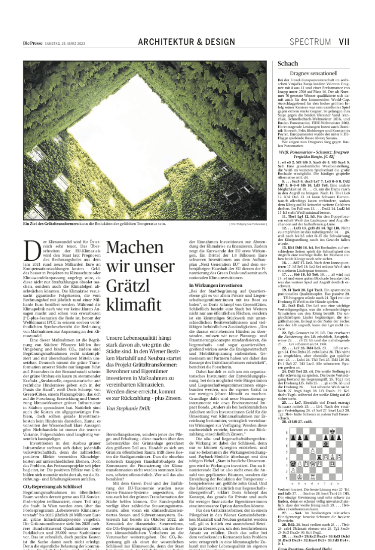 Unsere Lebensqualität wird künftig stark davon abhängen, wie grün die Städte sind, in denen wir leben. Doch die grüne Wende ist aufwändig. In den Wiener Bezirken Mariahilf und Neubau startet daher das Projekt Grätzltransformer: Bewohner*innen und Eigentümer*innen investieren in Maßnahmen zu vereinbarten Klimazielen. Werden diese erreicht, kommt es zur Rückzahlung – plus Zinsen. Stephanie Drlik in „Die Presse“ vom 27.03.2023
