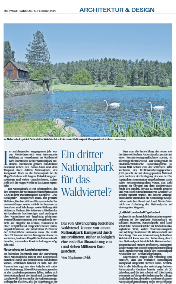 Ein dritter Nationalpark für Niederösterreich? Das von Abwanderung betroffene Waldviertel könnte von dem angekündigten „Nationalpark Kampwald“ durchaus profitieren. Bisher ist jedoch lediglich eine erste Startfinanzierung von rund sieben Millionen Euro gesichert. Stephanie Drlik in „Die Presse“ am 15.02.2025